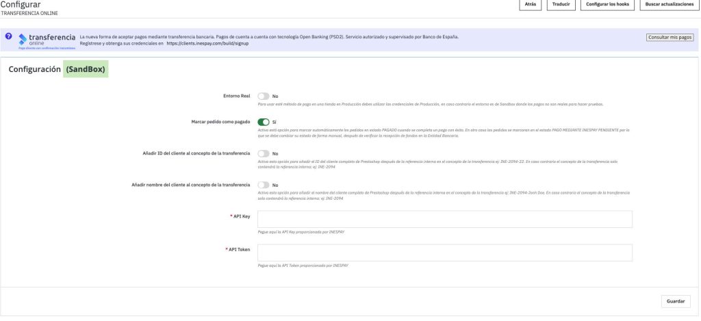 - Introduce las credenciales y detalles que Inespay te haya proporcionado